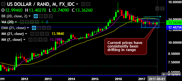 USDZAR has been drifting between upper side at 13.5311 and lower side at 12.3126 levels from last 8 months. Well, as the IVs of USDZAR are shrinking away, and as we could still foresee range bounded trend to persist for USDZAR in near future (refer monthly charts), and is puzzling this pair to drag slightly upward but very well within above stated range.