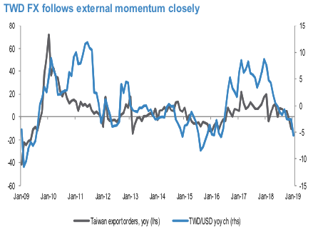 Taiwan export growth is now in negative territory and export orders have fallen back to early 2016 lows, with TWD FX moving in sync with such trends (refer above chart). Whilst it is fair to say that the currency is pricing in some of this weakness already, the continued downtrend in both the Taiwan and China economic activity surprise indices (EASIs) suggest concerns around the regional/global growth backdrop and supply chain demand will persist in the near term. To be sure, stimulatory efforts by the Chinese authorities should help stabilize activity momentum in the coming months but at the same time, this could be offset by US downside risks, particularly as the government shutdown continues.