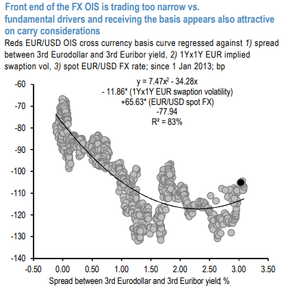 The analysis shows that the front end of the basis curve, and more specifically, the FX OIS basis are now trading too narrow (around 6-7bp) versus fundamental drivers such as USD/EUR money market yield spread, rates volatility, and FX (refer above chart).