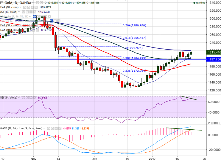 - Gold major resistance is around $1220 (100- day EMA) and any break above targets $1234/$1247 (50% retracement of $1375 and $1122) in the short term.