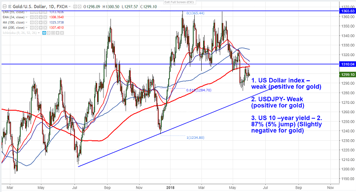 - Gold prices has once again declined slightly after showing a minor jump above $1300.US trade war and Italian political uncertainty are two major events to be watched for gold movement. Italian political uncertainty has eased as political parties agreed to form coalition government. But renewed trade war between US and other countries is supporting prices of yellow metal. US has imposed import tariff on steel and aluminum product yesterday on EU, Mexico and Canada. US commerce secretary Wilbur Ross said EU companies would face 25% duty on steel and 10% duty on aluminum from midnight on Thursday. The yellow metal hits high of $1306.49 and is currently trading around $1298. Market eyes US Nonfarm payroll which is to be released today for further direction.