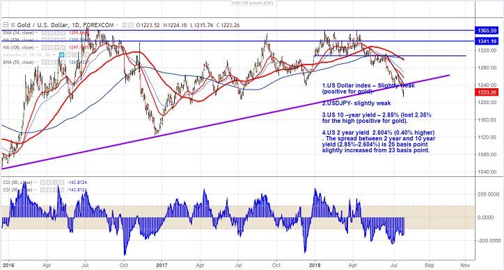 - Gold has shown a minor recovery after hitting low of $1211 on account of slight recovery in USD strength. It hits low of $1229.70 and is currently trading around $1221.85.