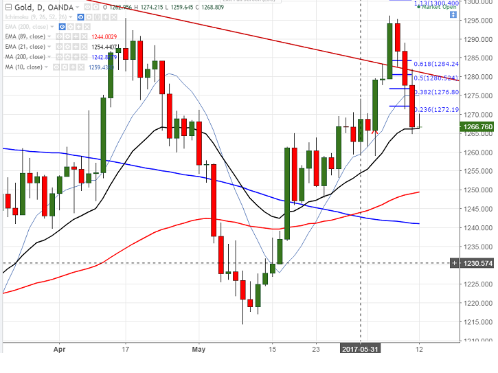 - In the 4 hours chart , gold’s near term support is around $1266 (21 EMA) and break below will drag the commodity down till $1249 (89 day EMA)/$1241 (200- MA).