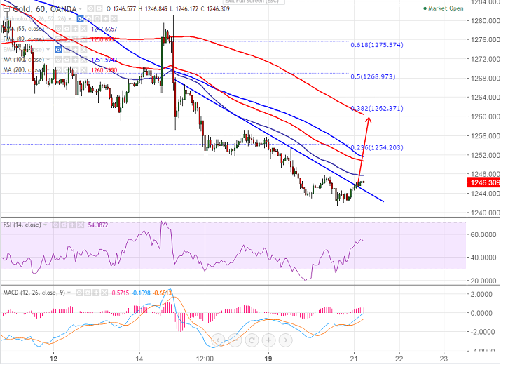 - On the higher side, in the hourly chart minor resistance is around $1250 (55- EMA) and any break above will take the commodity till $1260 (200- HMA)/$1263 (38.2% retracement of $1296 and $1243) /$1269 (daily Kijun-Sen).
