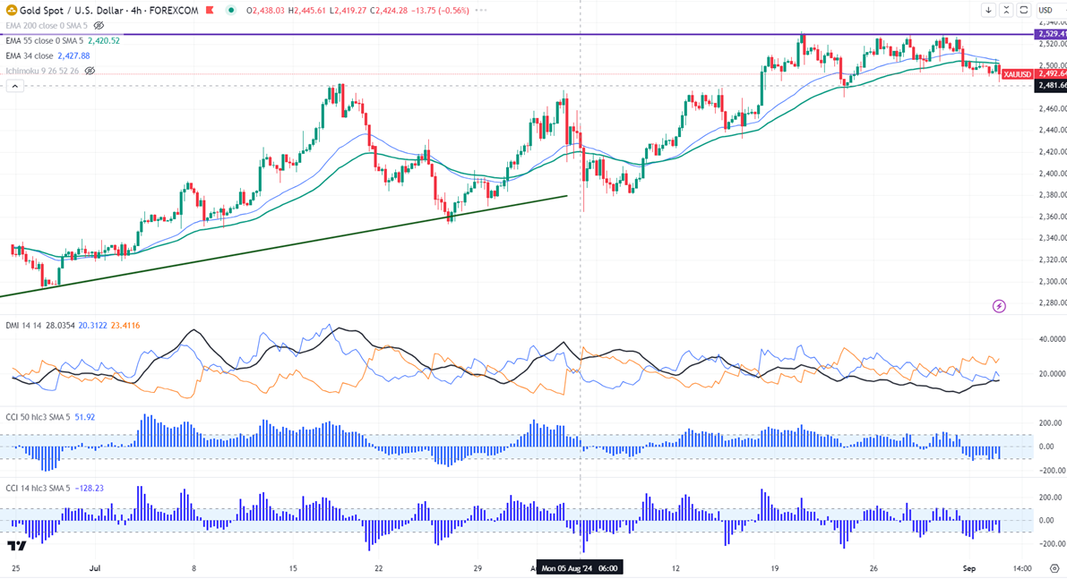 The yellow metal is trading below 34 and 55 H EMA in the 4-hour chart ($2502.47 and $2505). The weakness can be seen only if it closes below $2470. A break below targets $2450 is possible.