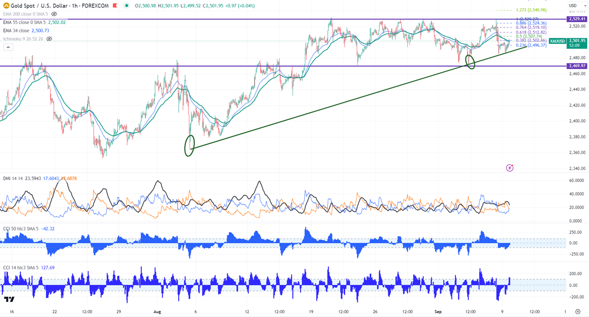 The yellow metal is trading above 34 and below 55 H EMA in the hourly chart ($2502 and $2500.64). The weakness can be seen only if it closes below $2470. A break below targets $2450 is possible.
