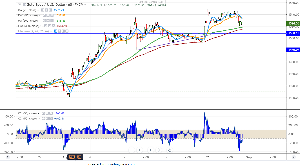 The yellow metal has shown a minor decline after hitting a high of $1555 due to profit booking and a slight recovery in US bond yield. The US 10-year yield is trading at 1.519% slightly up from low of 1.448% and any break above 1.55% (200-H MA) confirms minor bullishness, a jump till 1.582%/1.60%. It hits low of $1519.60 and is currently trading around $1524.55.
