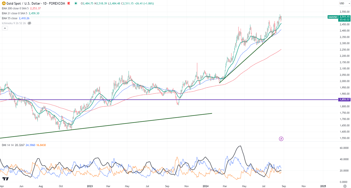 Gold gained sharply and holds above $2500 after Fed Chairman Powell's speech at the Jackson Hole symposium. He signals that it is time to adjust monetary policy.