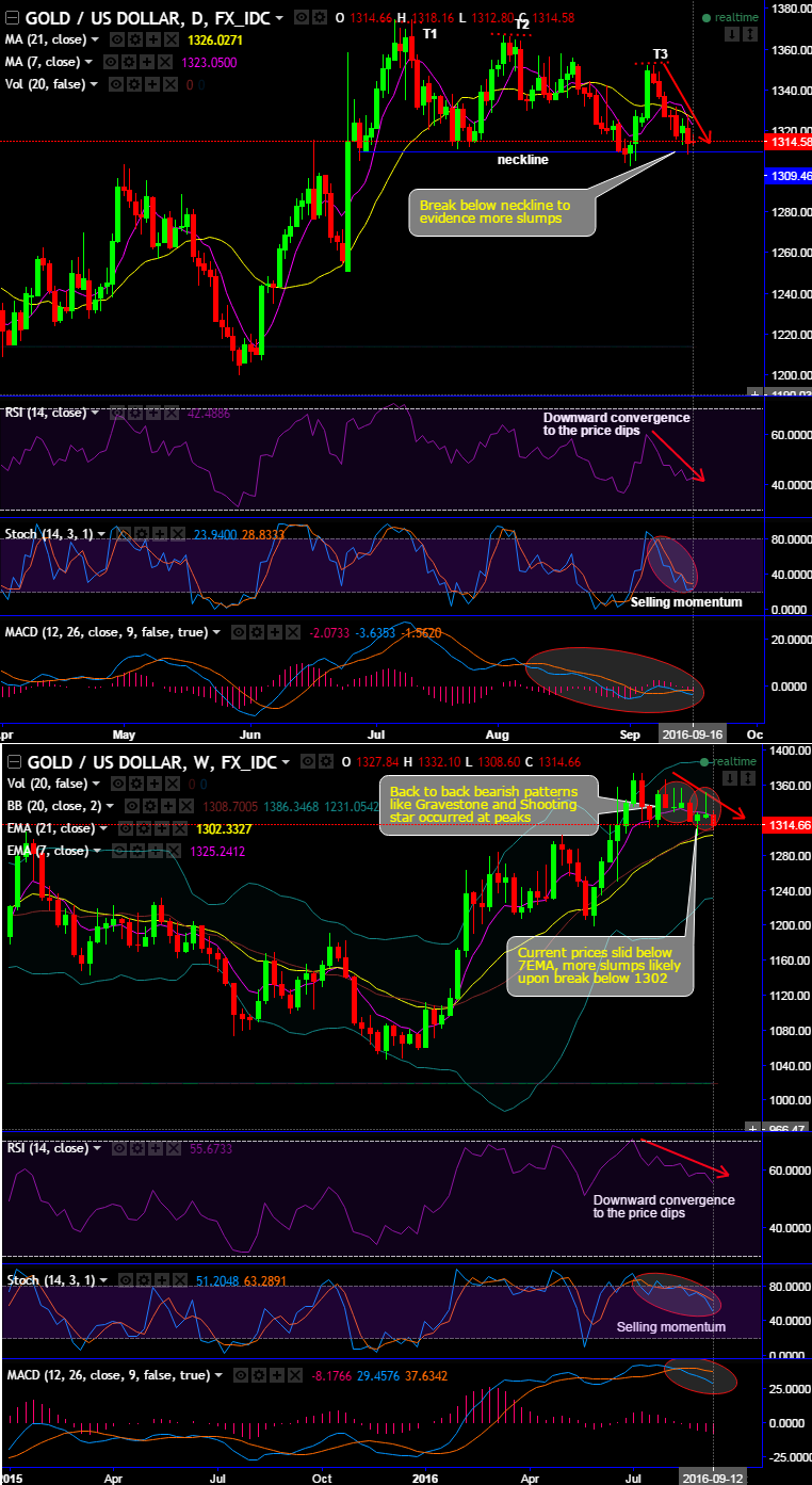 Current prices slid below 7EMA, more slumps likely upon the break below 1308 levels (i.e. the collapse below 21EMA).