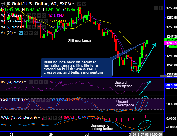 In this process, the bulls have managed to bounce back on hammer formation, the bullish pattern candle has occurred at $1,239.61 levels, consequently, rallies break-out the stiff resistance of 1245.77 levels (refer 1H chart).