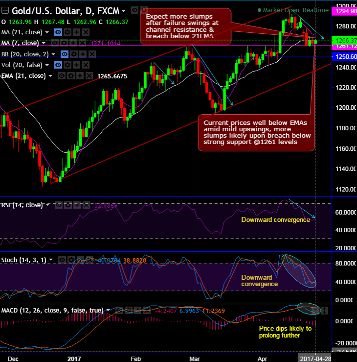 The current prices are well below EMAs amid mild upswings, for now, more slumps likely upon breach below strong supports at 1261 and 1250 levels.