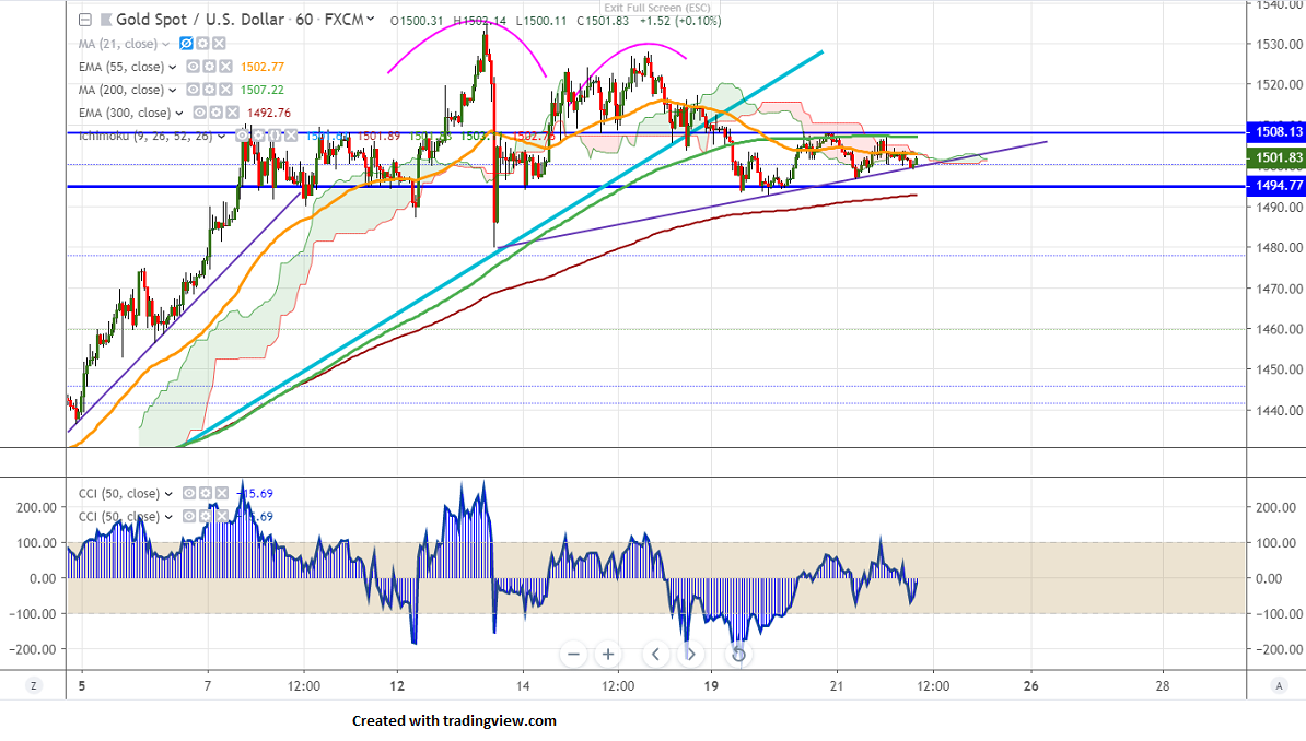 Gold is consolidating in a narrow range between $1528 and $1493 for the past three trading days. The FOMC minutes showed that Fed officials viewed their rate cut last month as insurance against too-low inflation and weak growth. According to the FedWatch tool, the probability of 50 bps rate cut has slightly increased from 1.5% yesterday to 2.7% and 25 bps chance has reduced from 98.5% to 97.3%. The yellow metal hits an intraday low of $1498.80 and is currently trading around $1501.76.