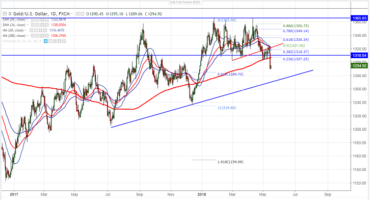 - Gold prices has declined more than $25 yesterday on account of rising US 10 year bond yield and US dollar. US 10 year bond yield jumped more than 3% yesterday and hits fresh 4 year high at 3.09%. US 10 year yield and Gold has perfect negative correlation with each other. It is currently trading around 3.06%.USD/JPY also broken major resistance 110 and jumped till 110.45 and is trading slightly above 200-day MA. US dollar index recovered sharply more than 100 pips yesterday till 93.45. the yellow metal shown minor jump after hitting low of $1288 and is currently trading around $1294.