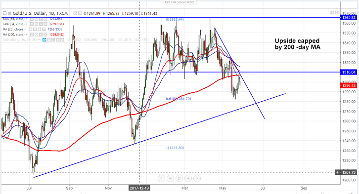 - The yellow metals near term resistance at $1307 (200- day MA) and any convincing break above will take the yellow metal till $1316 (55- day EMA)/ $1324 (50% fibo).