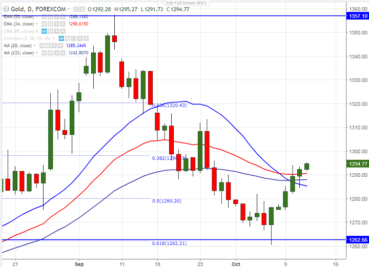- Technically gold is facing major resistance around $1298 (50- day MA) and any break above will take the yellow metal till $1302/$1309 (50% retracement of $1357 and $1260)