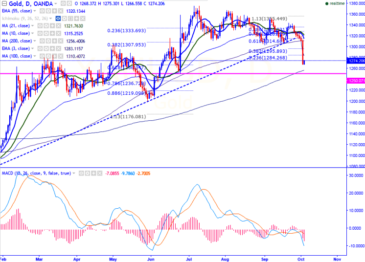 - On the higher side, resistance is around $1285 (23.6% retracement of $1375.30 and $1266.99) and any violation above targets $1292 (3- day EMA) /$1300. It should close above $1300 for further upside.