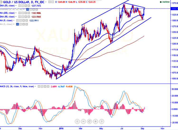 - The yellow metal has broken major resistance at $1332 (21- day MA) and jumped till $1352.61 at the time of writing. It is currently trading around $1351.63.