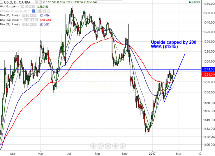 - Gold major resistance is around $1245(200- WMA) and any break above targets $1262 (200-day MA)/ $1278 (61.8% retracement of $1375 and $1122) is likely.