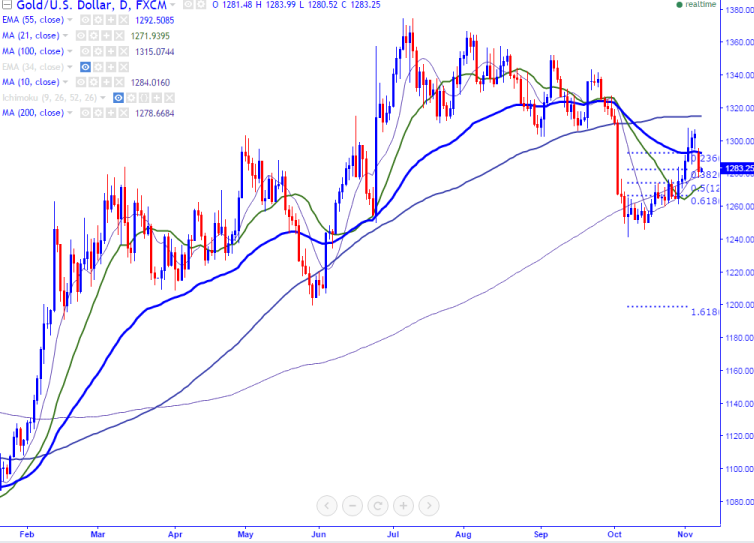 - Gold faces minor support at 10- day MA around $1284 and any break above targets $1292.85 (55- day EMA) /$1300. Any break above $1310 (61.8% fibo) confirms further bullishness. Any violation above $1310 will take the yellow metal to next level till $1314 (21- W MA)/$1322 in the short term.