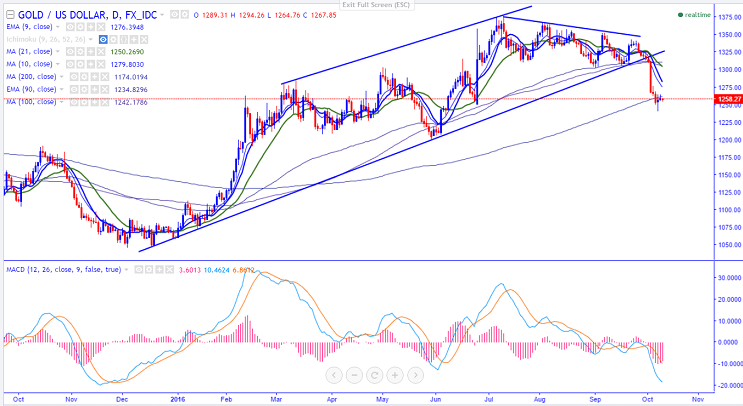 The yellow metal plummeted on Friday and declined till $1243, a level not seen till Jun 7th 2016. It has closed around $1257.39 slightly below 200- day MA ($1259.95).