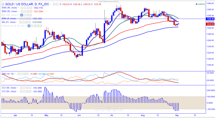 - The yellow metal has taken support near 90-day EMA and slightly jumped till $1316.50 at the time of writing. It is currently trading around $1313.27.