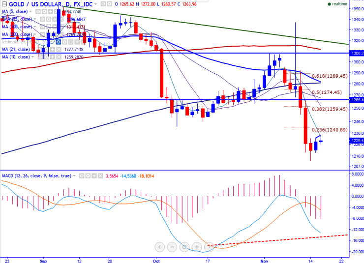 - Gold declined till $1211 and recovered from that level. It is currently trading around $1230.