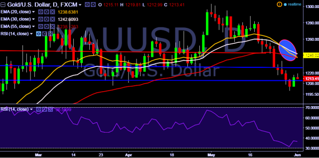 We prefer to take short position in XAU/USD around $1215, stop loss $1222 and target $1202 marks.