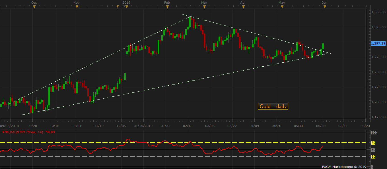The chart clearly shows that the bulls are enjoying a breakout at the moment. After last week’s failure to clear the down-trending line, gold is clearly in a buy breakout at the moment. President Trump has triggered the latest round of risk aversion by announcing 5 percent tariff on products from Mexico over border and immigration, “On June 10th, the United States will impose a 5% Tariff on all goods coming into our Country from Mexico, until such time as illegal migrants coming through Mexico, and into our Country, STOP. The Tariff will gradually increase until the Illegal Immigration problem is remedied.....at which time the Tariffs will be removed. Details from the White House to follow.”
