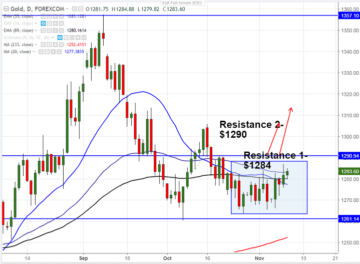 - Gold is trading steady at three week high on minor weakness in US dollar and uncertainty over US tax plan. The yellow metal has shown a minor jump till $1287 and is currently trading around $1284.