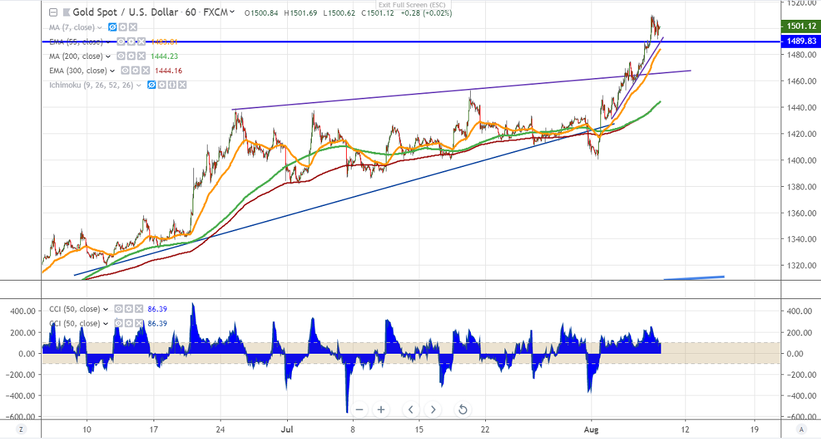 Gold hits fresh multiyear high due to the US-China trade war uncertainty and declining yield. US 10 year yield has declined more than 20% in the past 10 days, the steepest drop since Jul-Aug 2011. The yellow metal hits high of $1510 and is currently trading around $1500.91.
