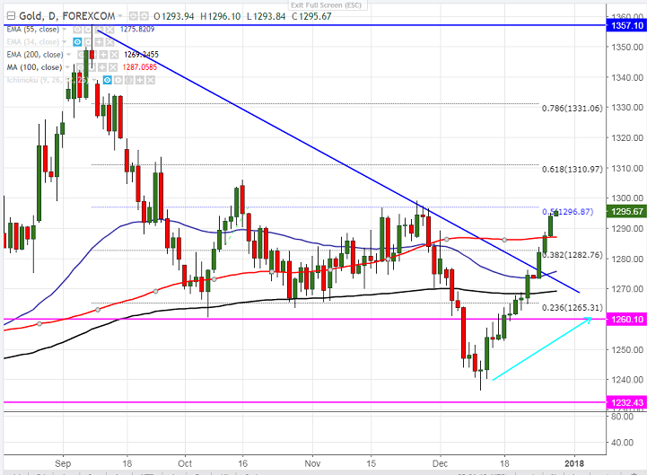 - On the higher side, gold is facing strong resistance at $1296 (50% retracement) and any break above will take the yellow metal till $1300. Any close above $1300 will take the gold to next level till $1324 (78.6% fib)/$1357 (Sep 2017 high)/$1375.