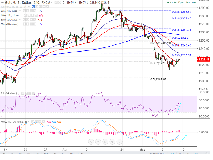 - On the higher side, near term resistance is around $1235 (55 4H EMA) and any break above targets $1245 (38.2% retracement of $1295 and $1214)/ $1256 (200 4H MA).