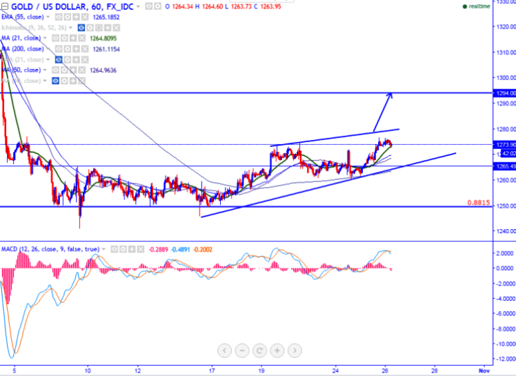 - Gold breaks minor resistance around $1275 and jumped slightly till $1276.67 on account demand in India due to festival season. It is currently trading around $1274.35.