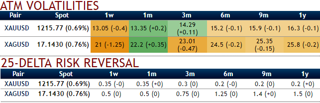 The current implied volatility of 1m ATM XAUUSD contracts are at 13% and above with positive skews signifying hedgers interests are in well balanced on either side but slightly biased towards OTM call strikes, and it is likely to spike higher for 1m tenors.