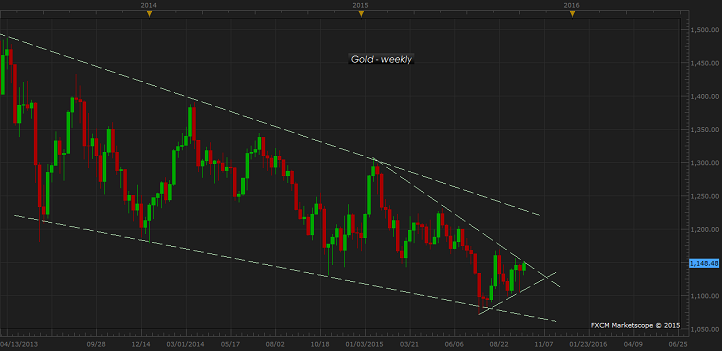 - Price is now at key cross road testing falling downtrend line which is resisting gold around $1150 area. Breaking which might lead gold towards $1225 area.