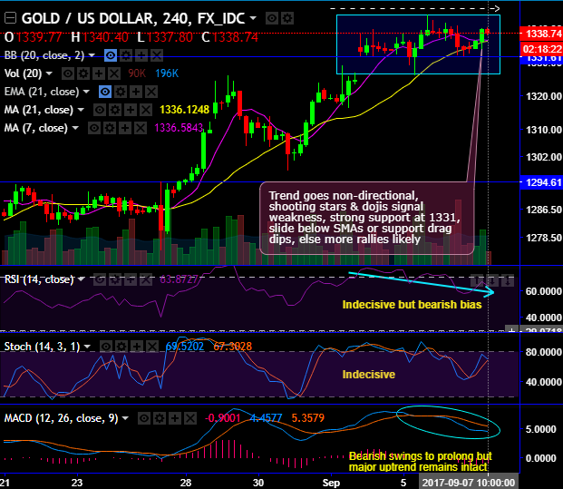 Gold price trend goes non-directional, shooting stars & dojis have occurred at 1333, 1339 and 1338 levels respectively that signal weakness at this juncture, the strong support is seen at 1331 levels, slide below SMAs or this support levels would drag dips upon bearish SMA crossover, otherwise, rallies seem most likely.