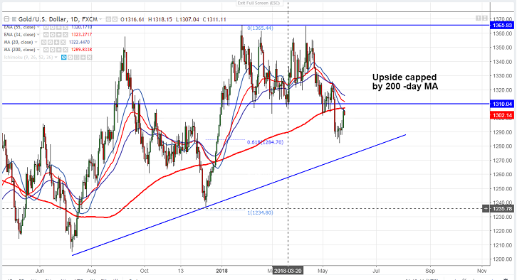 - Gold prices has jumped sharply almost $15 yesterday after a one week continuous selling. The yellow metal recovered almost 2% from the low of $1282 on account of renewed geo political tensions between US and China. The gold prices was supported by Trump’s statement that he was not pleased over recent talks with China. Trump also stated that summit with North Korean leader Kim Jong Un will not take place as planned on June 12th. The global equity markets are under pressure and US and German 10 –year government bond yields edged lower. USD/JPY has shown a jump of 77 pips from low of 108.95. It is currently trading around 109.56. US dollar index has recovered slightly from the yesterday low of 93.61. The yellow metal hits high of $1306 and is currently trading around $1301.99.