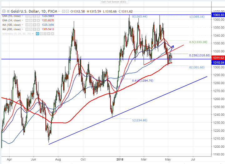 - The yellow metals near term resistance at $1316.60-$1318 (23.6% fib and trend line support turned into resistance) and any break above will take the yellow metal till $1324 (100- day MA)/$1328 (50- day MA).
