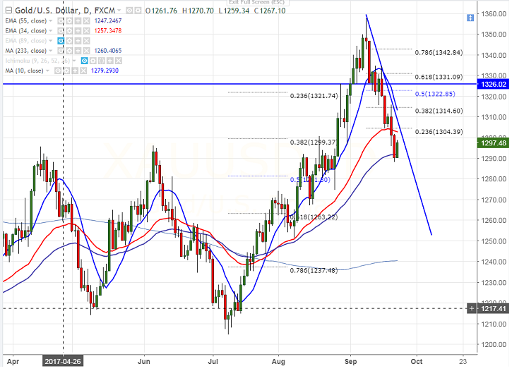 - Gold prices recovered slightly from the 4- week low on account of escalated tensions in North Korea. The yellow metal jumped almost $10 from yesterday low. It is currently trading around $1297 0.52% higher.