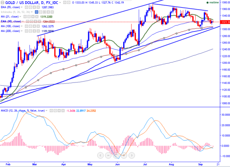 - The major support is around $1307 (90- day EMA) and any break below that level will drag the yellow metal down till $1297 (23.6% retracement of $1375 and $1047)/$1285 (50% retracement of $1199 and $1375.