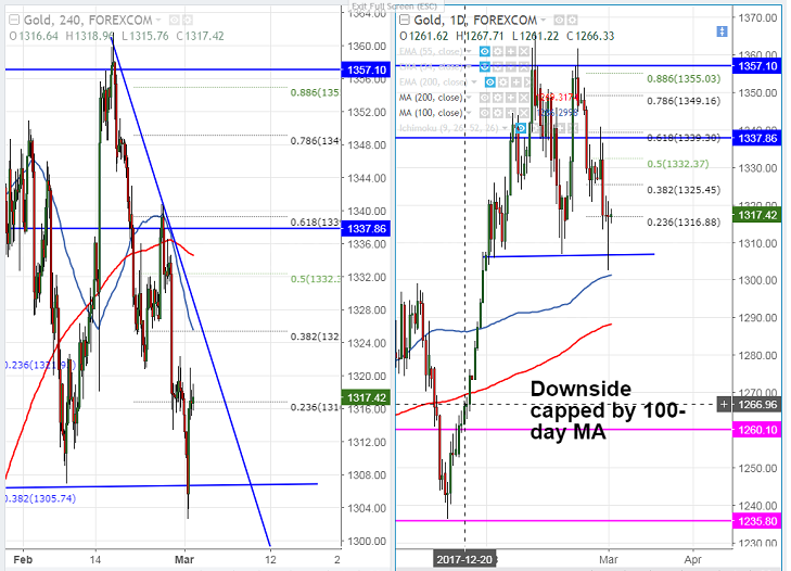 - On the lower side, any break below $1300 (100- day MA) will drag the gold down till $1287 (200- day MA). Bearish continuation only if it closes below $1287. Any violation below $1287 will drag the gold till $1282 (233- day MA)/$1275.