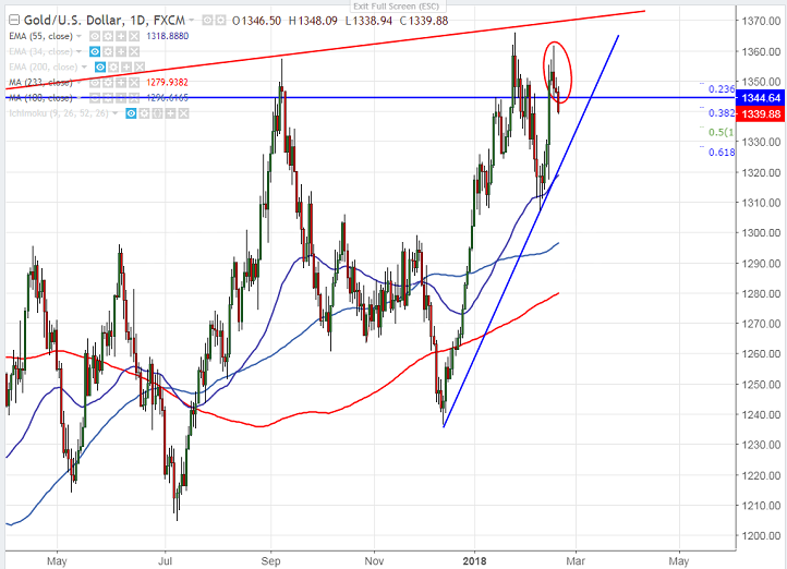 - On the lower side, any break below $1341 (38.2% fib) will drag the gold down till 1338 (20- day MA)/$1332 (10- day MA)/$1328. Bearish continuation only if it breaks below $1305 level.