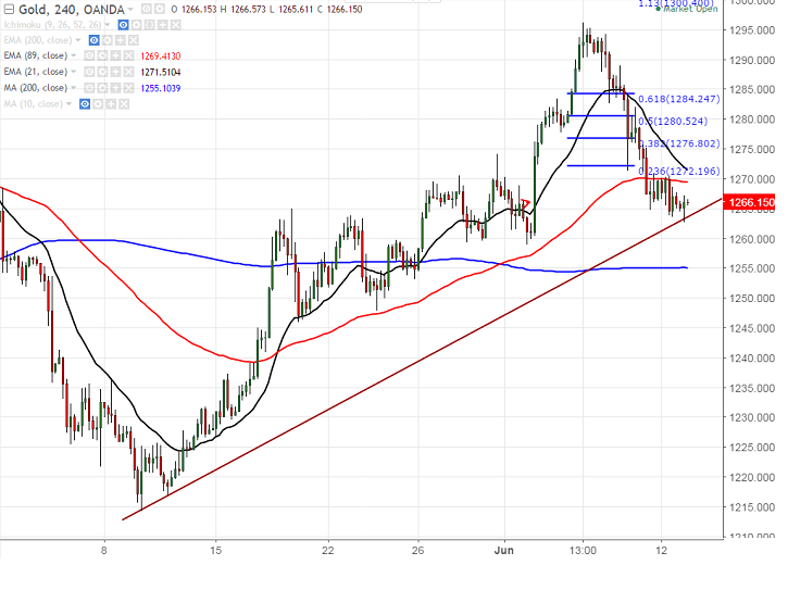 - In the 4 hours chart , gold’s near term support is around $1266 (21 EMA) and break below will drag the commodity down till $1249 (89 day EMA)/$1241 (200- MA).