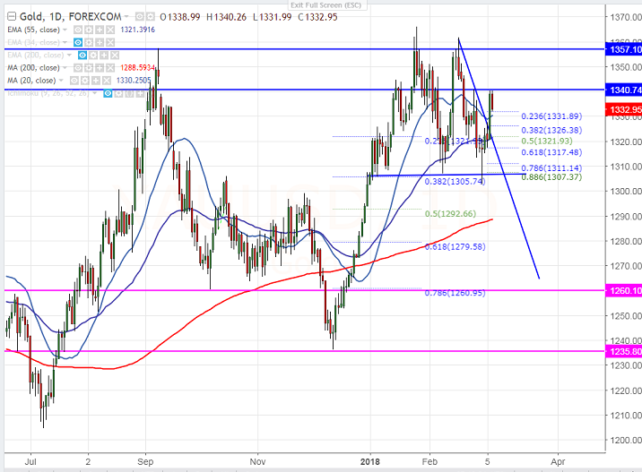 - The near term resistance is around $1341 and any break above will take the yellow metal till ay $1348/$1355. Overall bullish continuation only above $1366.