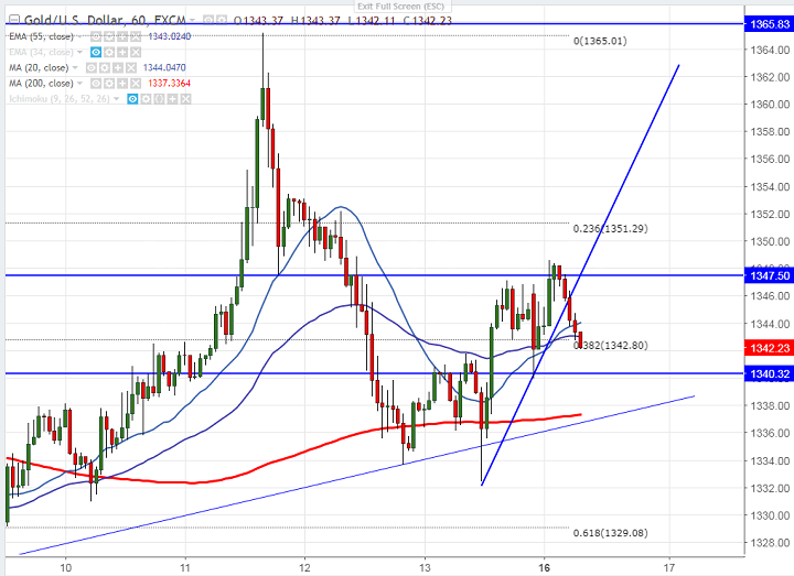 - On the lower side, near term support is around $1333 (20- day MA) and any break below will drag the yellow metal down till $1329 (61.8% fibo)/$1324.