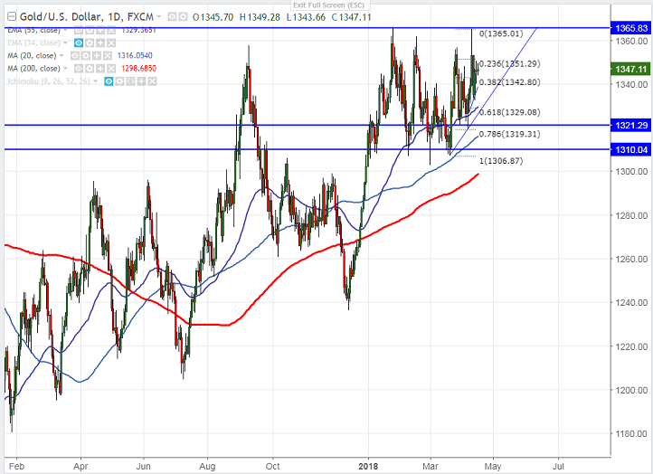- On the lower side, near term support is around $1333 (20- day MA) and any break below will drag the yellow metal down till $1329 (61.8% fibo)/$1324.