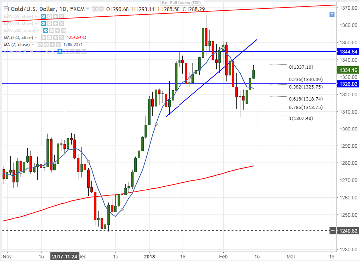 - Gold has jumped almost $15 from yesterday low on increasing market’s safety concerns. The yellow metal formed a minor bottom at $1306.95 on Feb 8th 2018 and minor weakness only below that level. The commodity breaks the major resistance of $1334.50 (20- day MA) in Asian session. It is current trading around $1334.31.