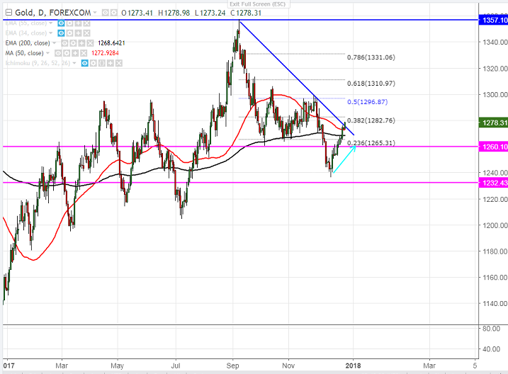 - On the higher side, gold is trading slightly above trend line resistance at $1275 and any convincing close above will take the yellow metal to next level till $1282/$1291/$1300. It should close above $1300 for further upside.
