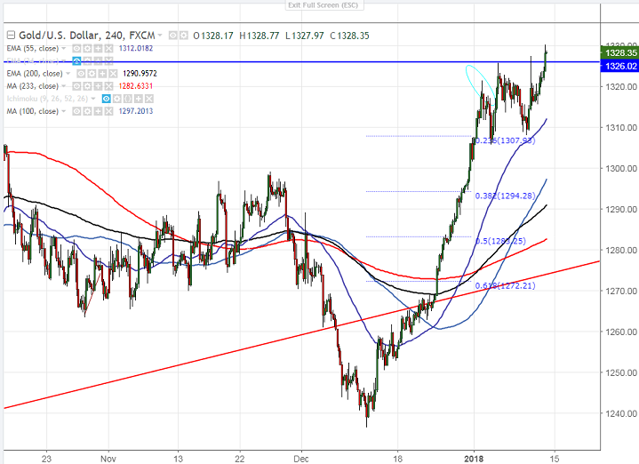 - On the higher side, gold is facing strong resistance at $1330 and any break above will take the yellow metal till $1339 (161.8% retracement)/$1350.