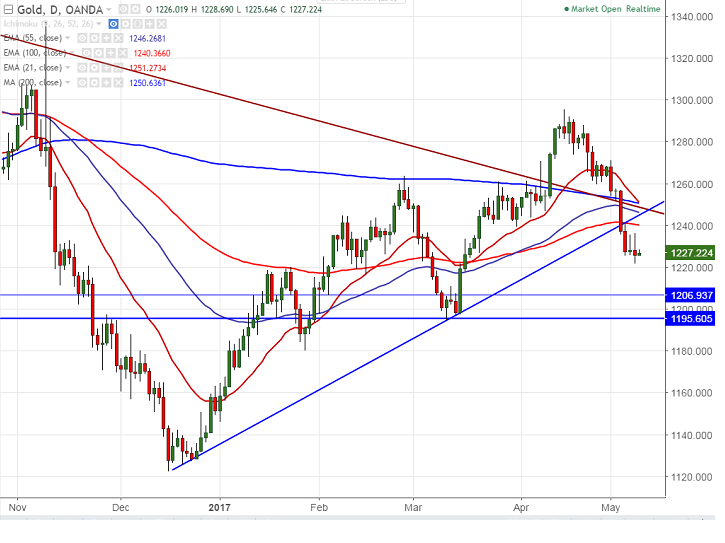 - Technically gold is facing strong support at $1219 (100 – day MA) and any break below will drag the yellow metal down till $1209/$1200. It should break below $1195 (Mar 10th 2017 low) for further weakness.